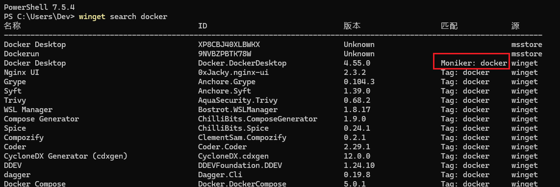 2.或者直接使用winget包管理安装,可以先搜一下,运行 winget search docker