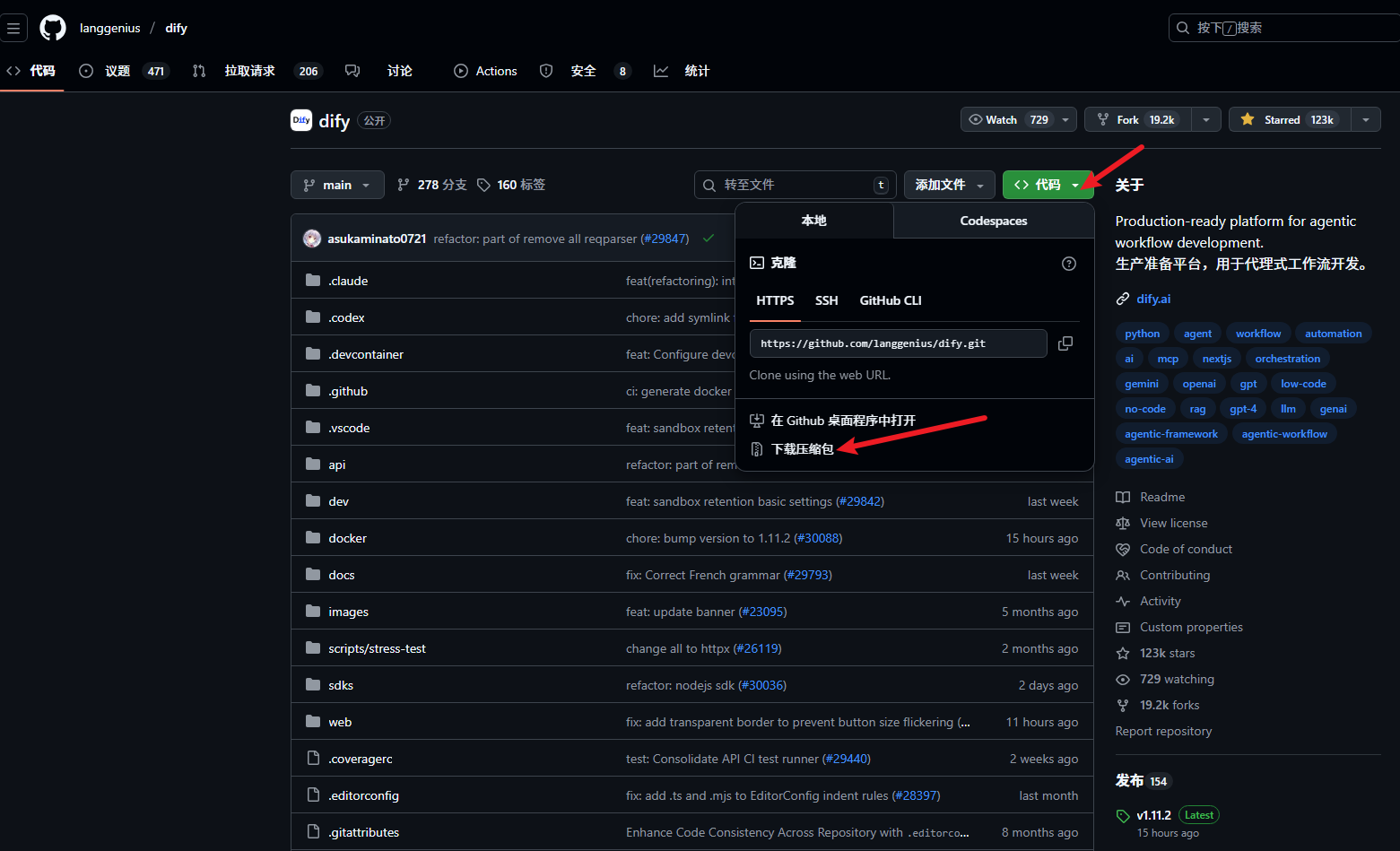 Dify是开源项目,虽然可以直接在GitHub找到下载压缩包来运行。 GitHub - langgenius/dify: Production-ready platform for agentic workflow development.