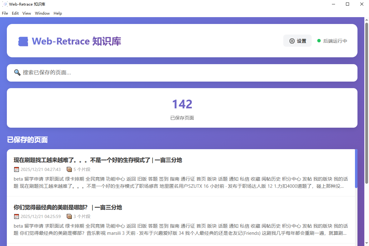 Web-Retrace 是我之前开发的一个本地优先的知识库工具,由三部分组成: