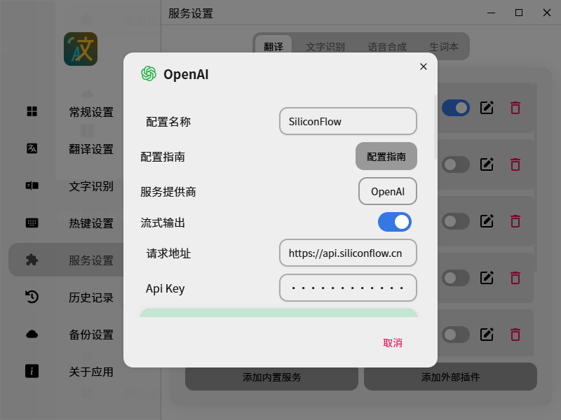 一开始发现翻译出结果有点慢,和之前豆包的相比。观察发现是因为服务会把内容翻译完之后才会返回给我,这样确实有点慢。然后打开服务设置里的流式传输,保存并重新测试,这下反应速度比豆包还快了。